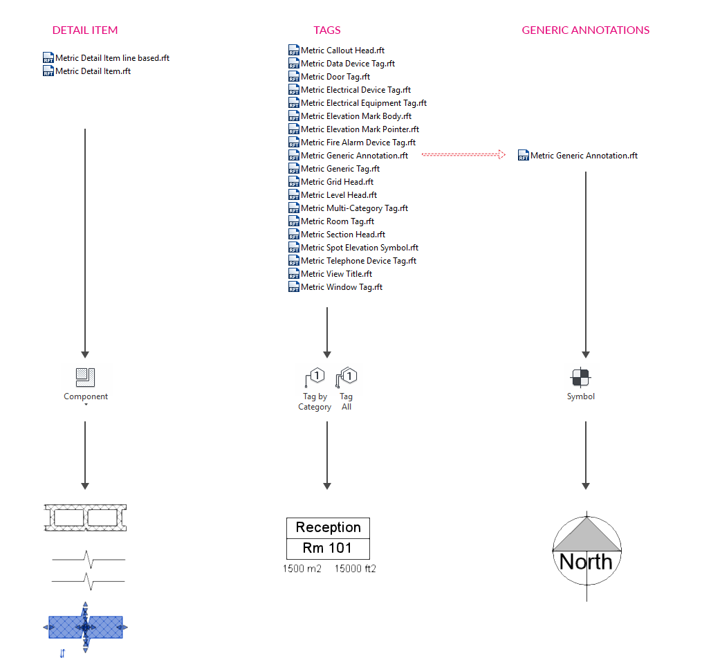Rodziny opisowe różnych kategorii zachowują się w różny sposób. Zaznaczyłem które rodziny tworzy się za pomocą jakiej templatki oraz jak się je wstawia do projektu a także przykład rodziny.