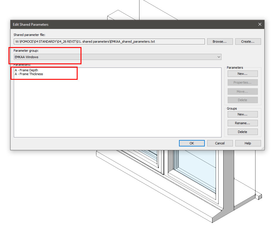 Dodałem do pliku Shared Parameters kategorię i dwa nowe parametry dla wymiarów ramy okna.